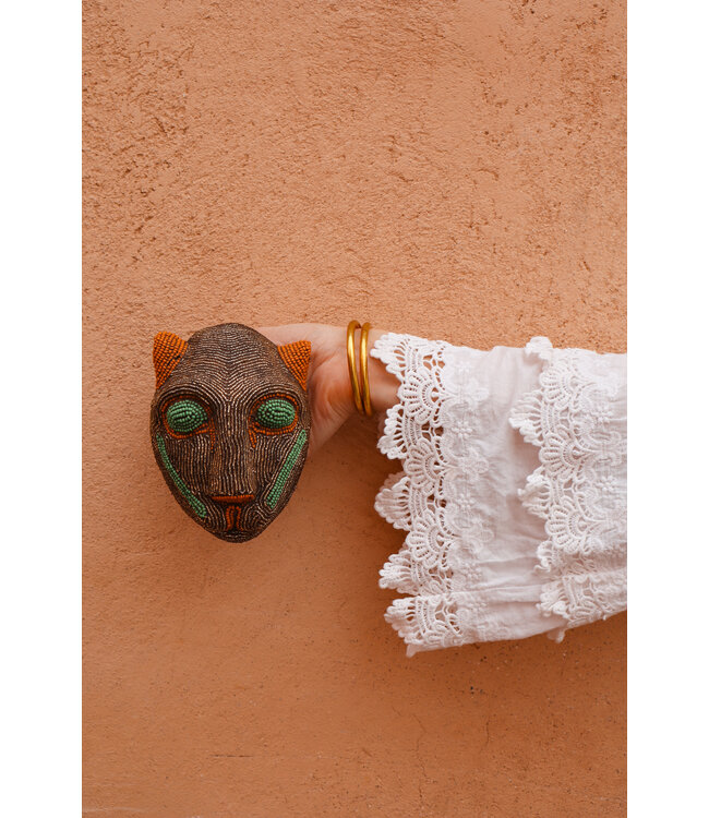 Hoe fantastisch is dit kralenhoofdje in de vorm van een panter?! Ik zag hem en was op slag verliefd! Hij is volledig met de hand gemaakt door de Bamiléké, een van de belangrijkste etnische groepen in Kameroen. Het hoofdje is gemaakt van aardewerk en versierd met glazen en/of keramische kraaltjes. Het is een waar kunstwerkje en een echte eyecatcher voor aan de muur!