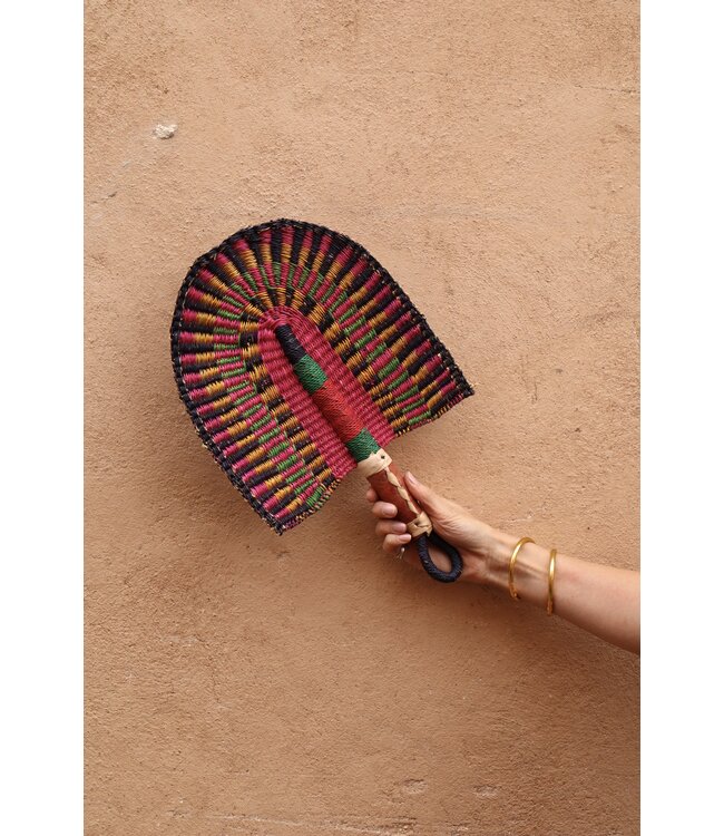 Deze kleurrijke Bolga waaier is met de hand vervaardigd van olifantsgras en is afkomstig uit de stad Bolgatanga in Ghana, nabij de grens van Burkina Faso. Hij is uiteraard toepasbaar als waaier bij warm weer, maar staat ook fantastisch als wanddecoratie! Wij zijn 'fan'! Hang er meerdere bij elkaar of combineer met onze messing treasures.