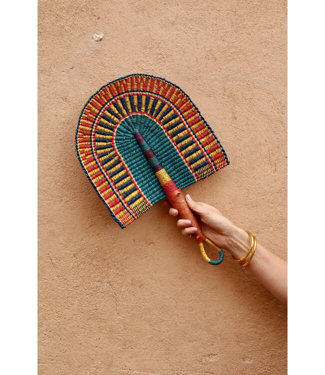 Deze kleurrijke Bolga waaier is met de hand vervaardigd van olifantsgras en is afkomstig uit de stad Bolgatanga in Ghana, nabij de grens van Burkina Faso. Hij is uiteraard toepasbaar als waaier bij warm weer, maar staat ook fantastisch als wanddecoratie! Wij zijn 'fan'! Hang er meerdere bij elkaar of combineer met onze messing treasures.