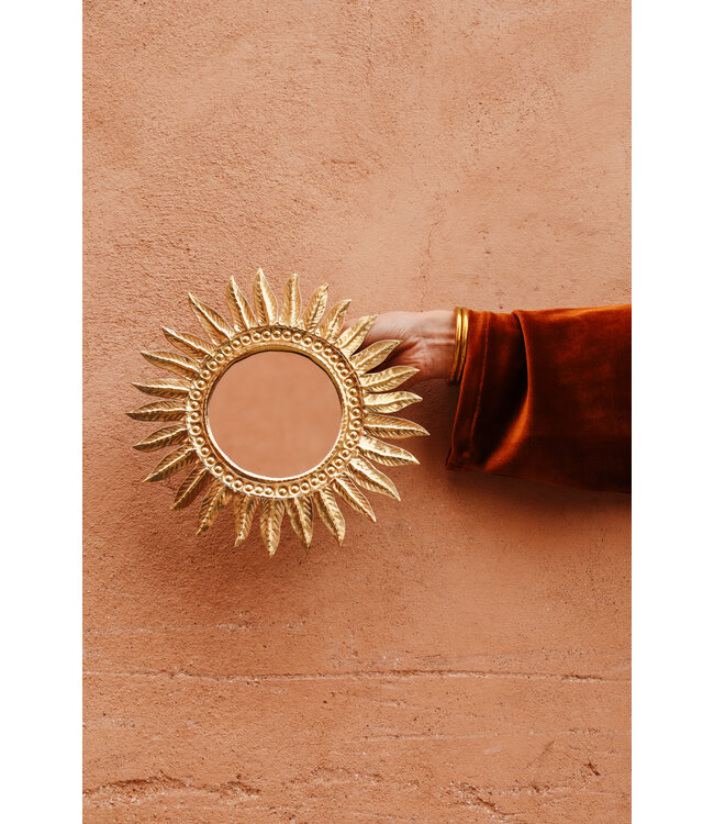 Messing spiegel in de vorm van een zon die met de hand is vervaardigd door ambachtslieden in Marokko. Hang ze met een groepje bij elkaar of combineer met onze andere messing spiegels of wanddecoratie.
