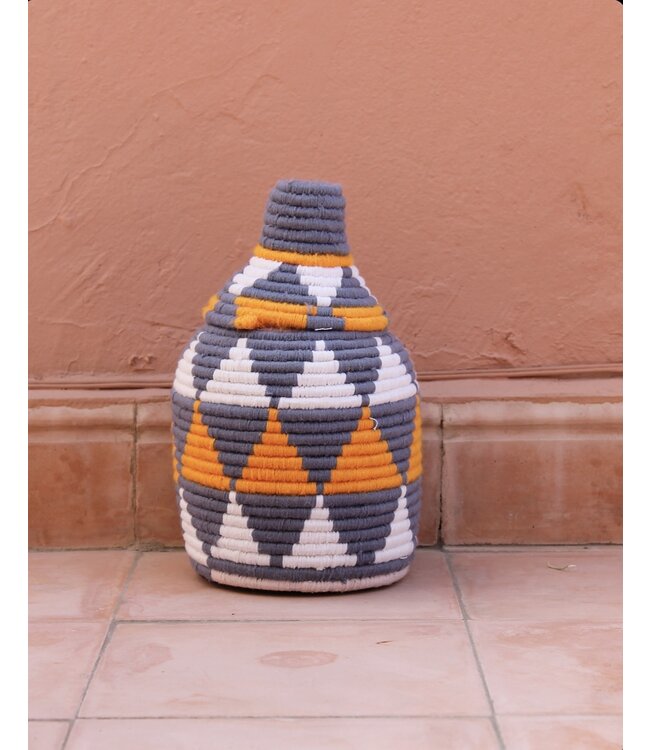 De manden zijn volledig met de hand gemaakt in het noorden van Marokko. De manden krijgen hun eigen patroon en kleur welke handmatig met wol op de mand wordt geweven. Van elke mand is er slechts één stuk verkrijgbaar en is daardoor uniek in zijn soort!