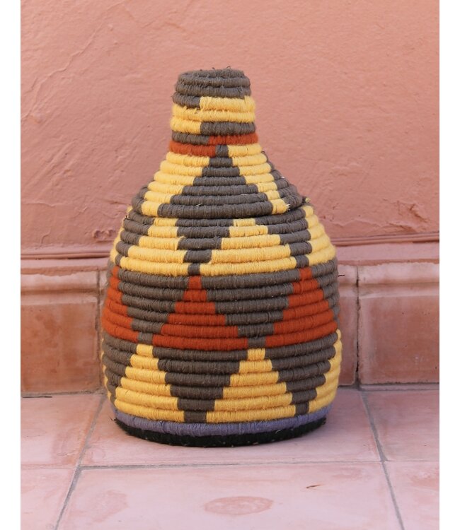 De manden zijn volledig met de hand gemaakt in het noorden van Marokko. De manden krijgen hun eigen patroon en kleur welke handmatig met wol op de mand wordt geweven. Van elke mand is er slechts één stuk verkrijgbaar en is daardoor uniek in zijn soort!