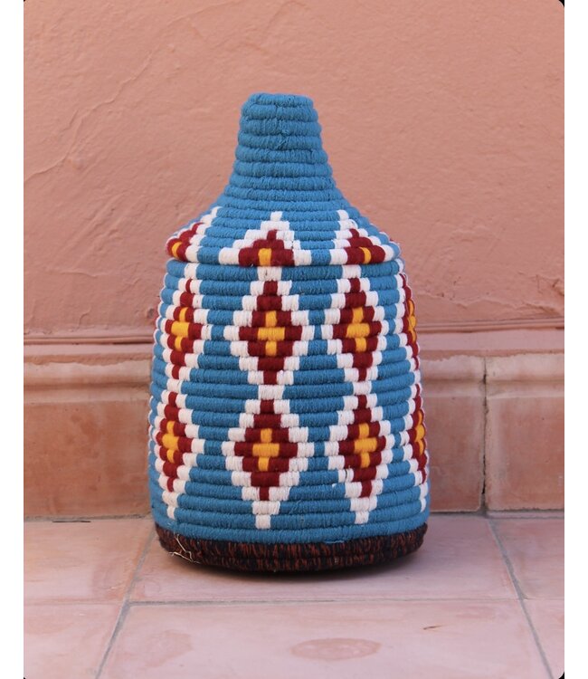 De manden zijn volledig met de hand gemaakt in het noorden van Marokko. De manden krijgen hun eigen patroon en kleur welke handmatig met wol op de mand wordt geweven. Van elke mand is er slechts één stuk verkrijgbaar en is daardoor uniek in zijn soort!