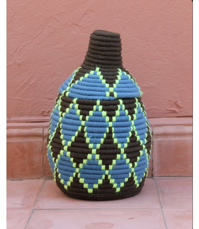 De manden zijn volledig met de hand gemaakt in het noorden van Marokko. De manden krijgen hun eigen patroon en kleur welke handmatig met wol op de mand wordt geweven. Van elke mand is er slechts één stuk verkrijgbaar en is daardoor uniek in zijn soort!