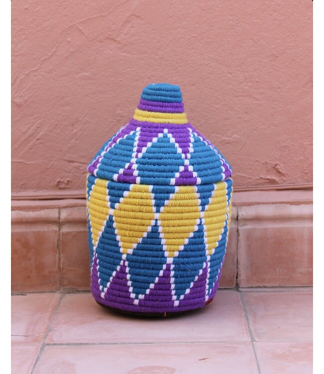 De manden zijn volledig met de hand gemaakt in het noorden van Marokko. De manden krijgen hun eigen patroon en kleur welke handmatig met wol op de mand wordt geweven. Van elke mand is er slechts één stuk verkrijgbaar en is daardoor uniek in zijn soort!