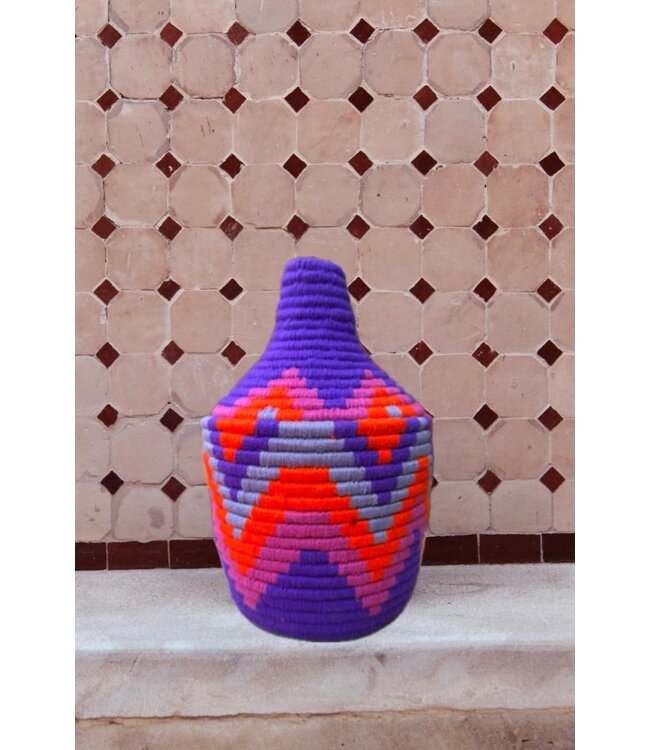 De manden zijn volledig met de hand gemaakt in het noorden van Marokko. De manden krijgen hun eigen patroon en kleur welke handmatig met wol op de mand wordt geweven. Van elke mand is er slechts één stuk verkrijgbaar en is daardoor uniek in zijn soort!