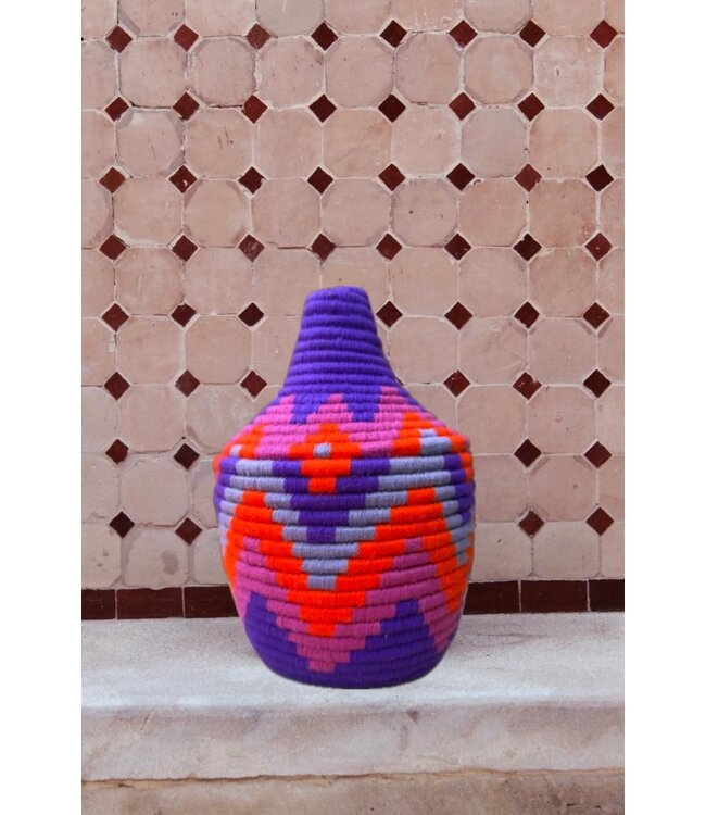 De manden zijn volledig met de hand gemaakt in het noorden van Marokko. De manden krijgen hun eigen patroon en kleur welke handmatig met wol op de mand wordt geweven. Van elke mand is er slechts één stuk verkrijgbaar en is daardoor uniek in zijn soort!