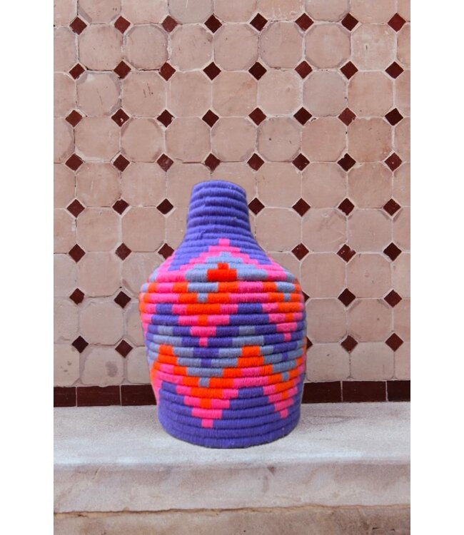 De manden zijn volledig met de hand gemaakt in het noorden van Marokko. De manden krijgen hun eigen patroon en kleur welke handmatig met wol op de mand wordt geweven. Van elke mand is er slechts één stuk verkrijgbaar en is daardoor uniek in zijn soort!