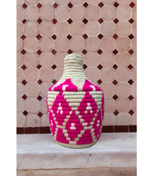 De manden zijn volledig met de hand gemaakt in het noorden van Marokko. De manden krijgen hun eigen patroon en kleur welke handmatig met wol op de mand wordt geweven. Van elke mand is er slechts één stuk verkrijgbaar en is daardoor uniek in zijn soort!