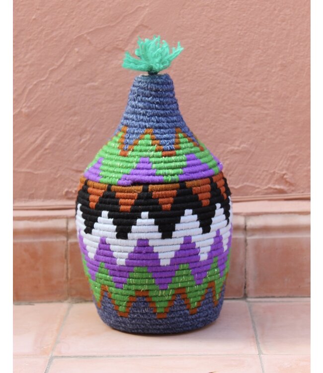De manden zijn volledig met de hand gemaakt in het noorden van Marokko. De manden krijgen hun eigen patroon en kleur welke handmatig met wol op de mand wordt geweven. Van elke mand is er slechts één stuk verkrijgbaar en is daardoor uniek in zijn soort!