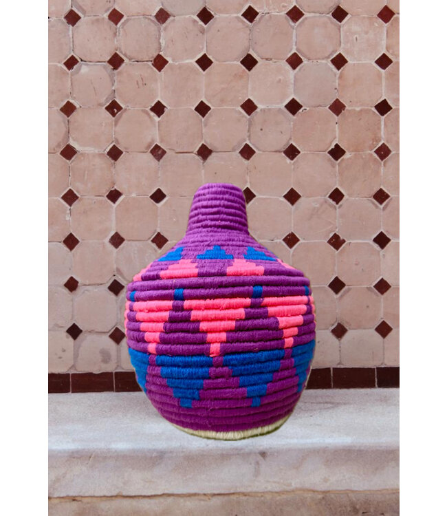 De manden zijn volledig met de hand gemaakt in het noorden van Marokko. De manden krijgen hun eigen patroon en kleur welke handmatig met wol op de mand wordt geweven. Van elke mand is er slechts één stuk verkrijgbaar en is daardoor uniek in zijn soort!