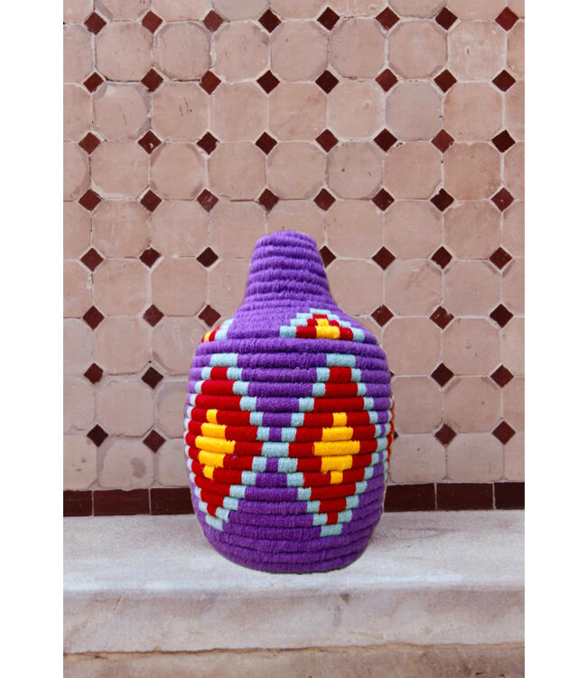 De manden zijn volledig met de hand gemaakt in het noorden van Marokko. De manden krijgen hun eigen patroon en kleur welke handmatig met wol op de mand wordt geweven. Van elke mand is er slechts één stuk verkrijgbaar en is daardoor uniek in zijn soort!