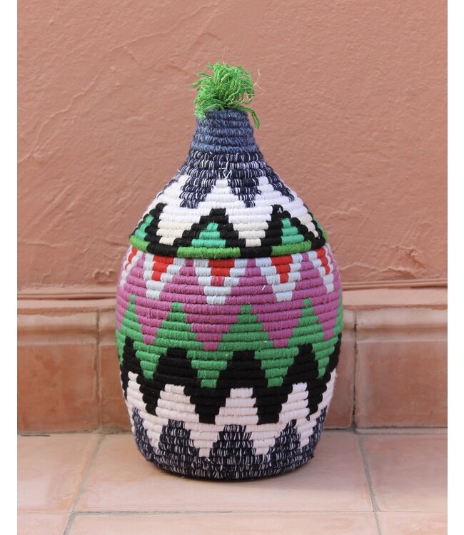 De manden zijn volledig met de hand gemaakt in het noorden van Marokko. De manden krijgen hun eigen patroon en kleur welke handmatig met wol op de mand wordt geweven. Van elke mand is er slechts één stuk verkrijgbaar en is daardoor uniek in zijn soort!