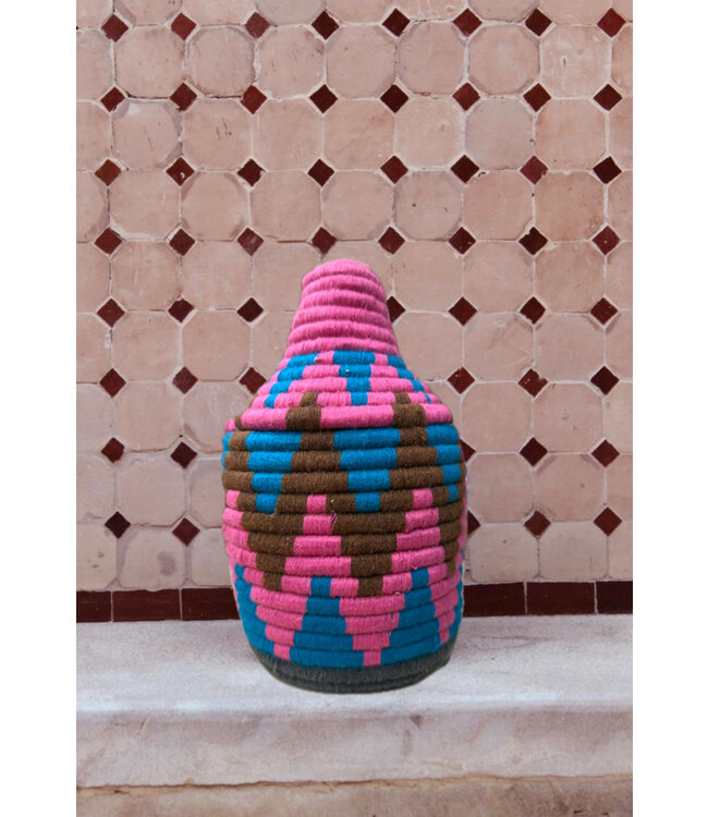 De manden zijn volledig met de hand gemaakt in het noorden van Marokko. De manden krijgen hun eigen patroon en kleur welke handmatig met wol op de mand wordt geweven. Van elke mand is er slechts één stuk verkrijgbaar en is daardoor uniek in zijn soort!