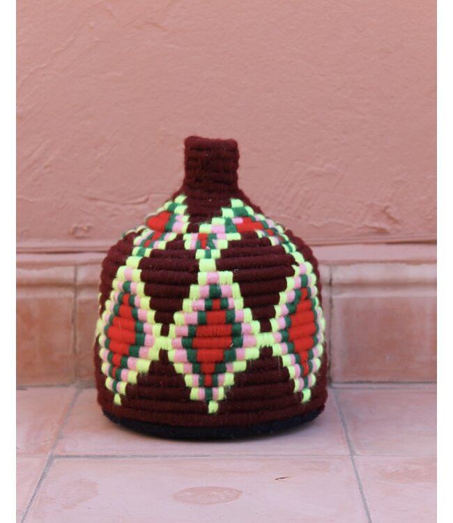 De manden zijn volledig met de hand gemaakt in het noorden van Marokko. De manden krijgen hun eigen patroon en kleur welke handmatig met wol op de mand wordt geweven. Van elke mand is er slechts één stuk verkrijgbaar en is daardoor uniek in zijn soort!