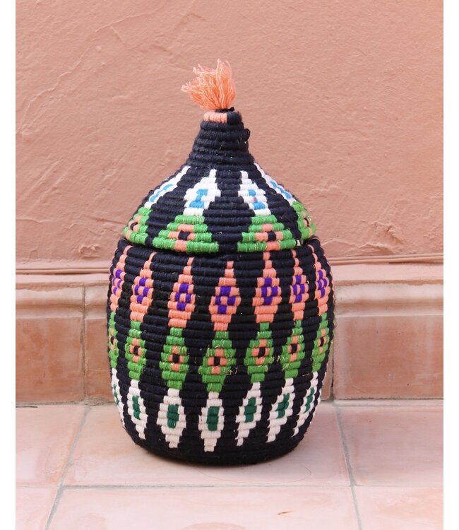 De manden zijn volledig met de hand gemaakt in het noorden van Marokko. De manden krijgen hun eigen patroon en kleur welke handmatig met wol op de mand wordt geweven. Van elke mand is er slechts één stuk verkrijgbaar en is daardoor uniek in zijn soort!