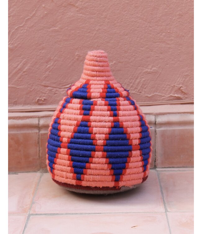 De manden zijn volledig met de hand gemaakt in het noorden van Marokko. De manden krijgen hun eigen patroon en kleur welke handmatig met wol op de mand wordt geweven. Van elke mand is er slechts één stuk verkrijgbaar en is daardoor uniek in zijn soort!