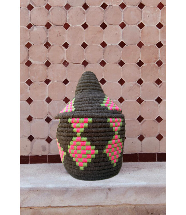 De manden zijn volledig met de hand gemaakt in het noorden van Marokko. De manden krijgen hun eigen patroon en kleur welke handmatig met wol op de mand wordt geweven. Van elke mand is er slechts één stuk verkrijgbaar en is daardoor uniek in zijn soort!