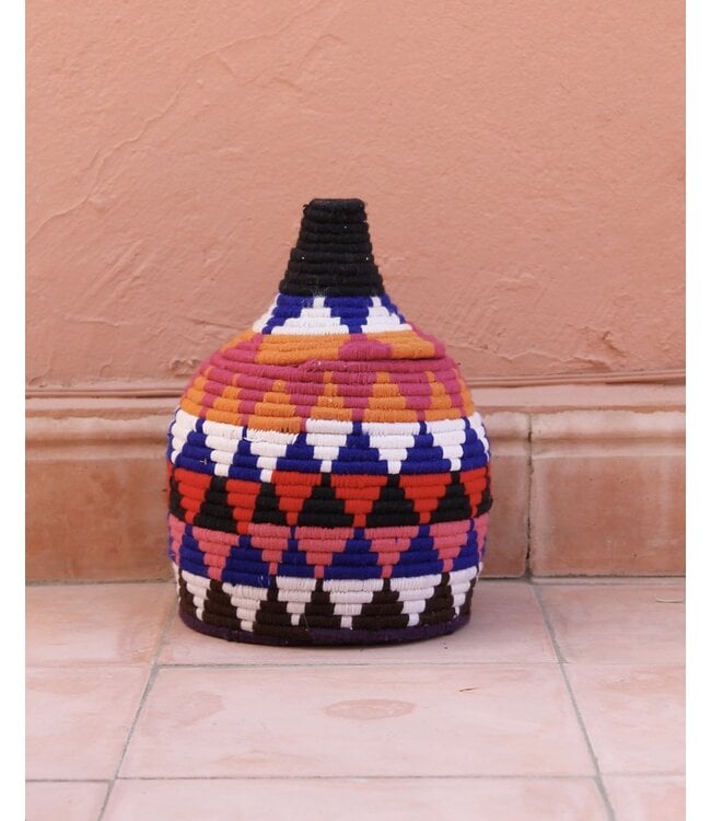 De manden zijn volledig met de hand gemaakt in het noorden van Marokko. De manden krijgen hun eigen patroon en kleur welke handmatig met wol op de mand wordt geweven. Van elke mand is er slechts één stuk verkrijgbaar en is daardoor uniek in zijn soort!