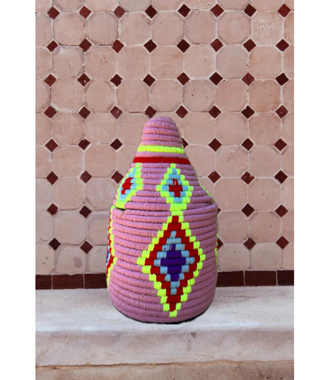 De manden zijn volledig met de hand gemaakt in het noorden van Marokko. De manden krijgen hun eigen patroon en kleur welke handmatig met wol op de mand wordt geweven. Van elke mand is er slechts één stuk verkrijgbaar en is daardoor uniek in zijn soort!