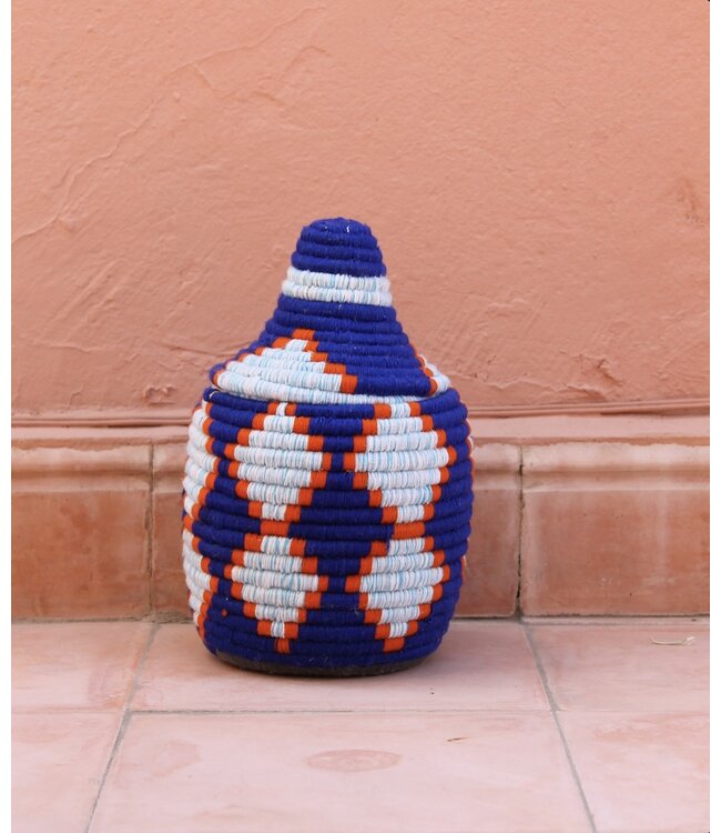 De manden zijn volledig met de hand gemaakt in het noorden van Marokko. De manden krijgen hun eigen patroon en kleur welke handmatig met wol op de mand wordt geweven. Van elke mand is er slechts één stuk verkrijgbaar en is daardoor uniek in zijn soort!