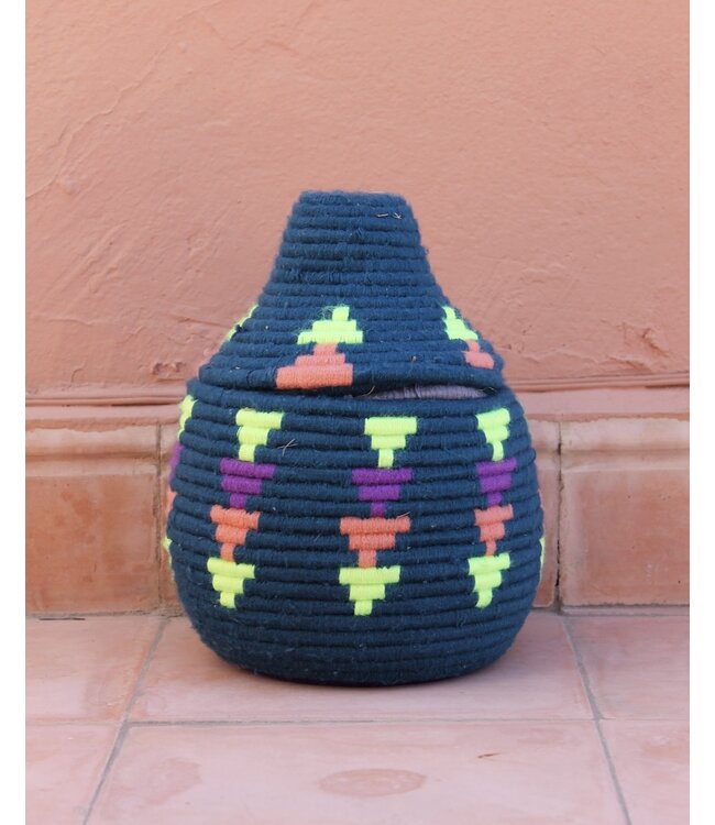 De manden zijn volledig met de hand gemaakt in het noorden van Marokko. De manden krijgen hun eigen patroon en kleur welke handmatig met wol op de mand wordt geweven. Van elke mand is er slechts één stuk verkrijgbaar en is daardoor uniek in zijn soort!