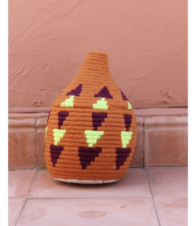 De manden zijn volledig met de hand gemaakt in het noorden van Marokko. De manden krijgen hun eigen patroon en kleur welke handmatig met wol op de mand wordt geweven. Van elke mand is er slechts één stuk verkrijgbaar en is daardoor uniek in zijn soort!