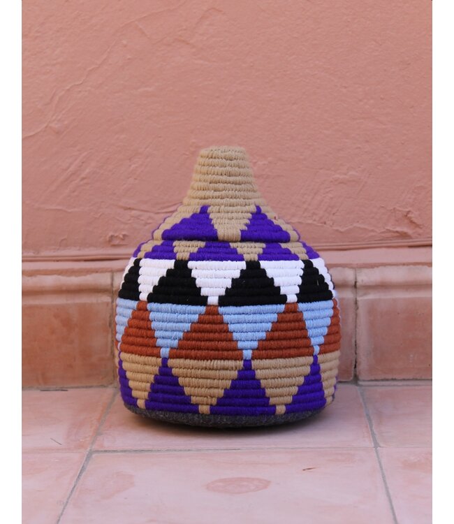 De manden zijn volledig met de hand gemaakt in het noorden van Marokko. De manden krijgen hun eigen patroon en kleur welke handmatig met wol op de mand wordt geweven. Van elke mand is er slechts één stuk verkrijgbaar en is daardoor uniek in zijn soort!