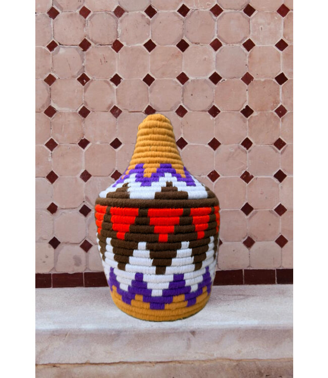 De manden zijn volledig met de hand gemaakt in het noorden van Marokko. De manden krijgen hun eigen patroon en kleur welke handmatig met wol op de mand wordt geweven. Van elke mand is er slechts één stuk verkrijgbaar en is daardoor uniek in zijn soort!