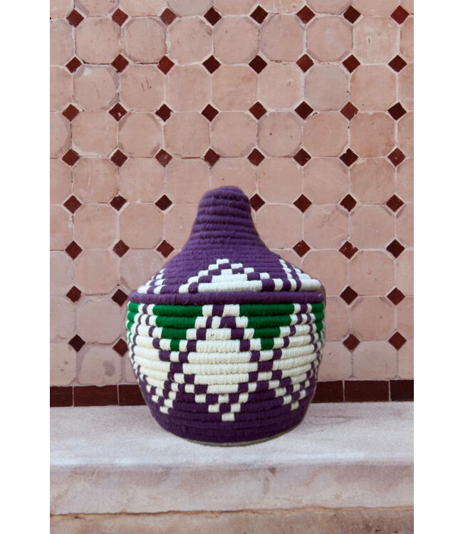 De manden zijn volledig met de hand gemaakt in het noorden van Marokko. De manden krijgen hun eigen patroon en kleur welke handmatig met wol op de mand wordt geweven. Van elke mand is er slechts één stuk verkrijgbaar en is daardoor uniek in zijn soort!