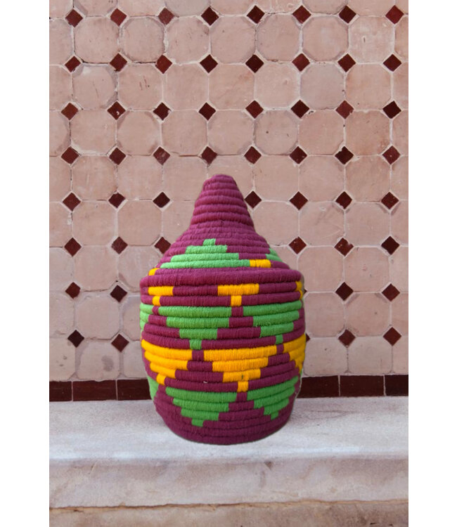 De manden zijn volledig met de hand gemaakt in het noorden van Marokko. De manden krijgen hun eigen patroon en kleur welke handmatig met wol op de mand wordt geweven. Van elke mand is er slechts één stuk verkrijgbaar en is daardoor uniek in zijn soort!