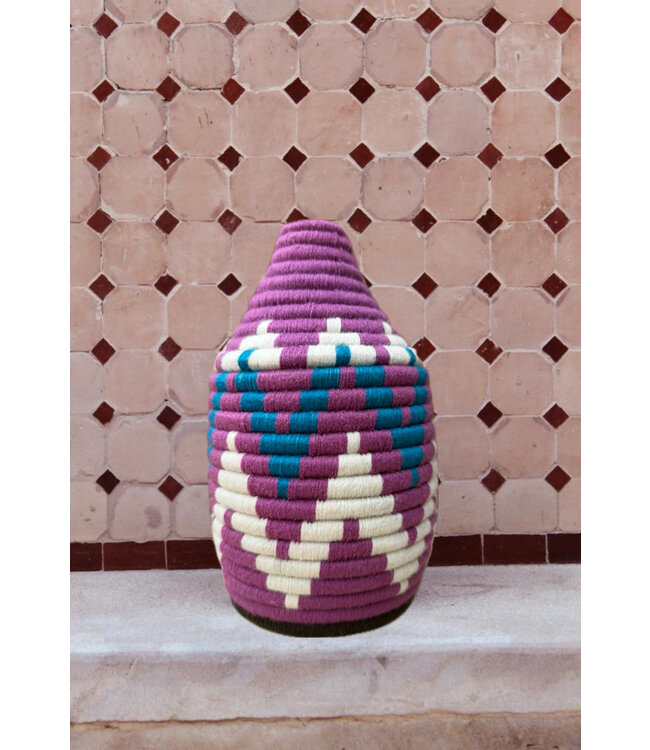 De manden zijn volledig met de hand gemaakt in het noorden van Marokko. De manden krijgen hun eigen patroon en kleur welke handmatig met wol op de mand wordt geweven. Van elke mand is er slechts één stuk verkrijgbaar en is daardoor uniek in zijn soort!