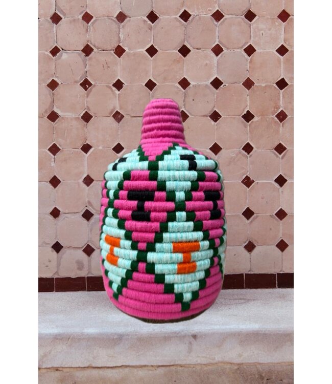 De manden zijn volledig met de hand gemaakt in het noorden van Marokko. De manden krijgen hun eigen patroon en kleur welke handmatig met wol op de mand wordt geweven. Van elke mand is er slechts één stuk verkrijgbaar en is daardoor uniek in zijn soort!