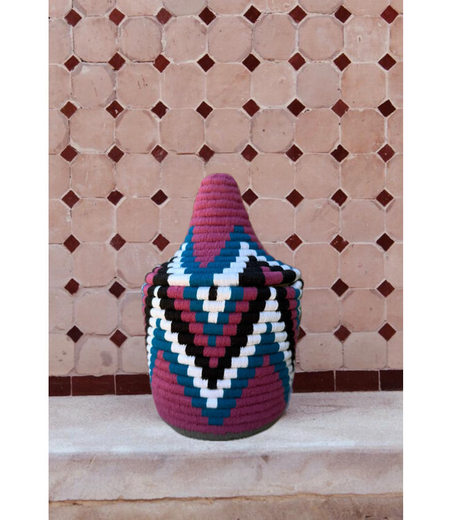 De manden zijn volledig met de hand gemaakt in het noorden van Marokko. De manden krijgen hun eigen patroon en kleur welke handmatig met wol op de mand wordt geweven. Van elke mand is er slechts één stuk verkrijgbaar en is daardoor uniek in zijn soort!