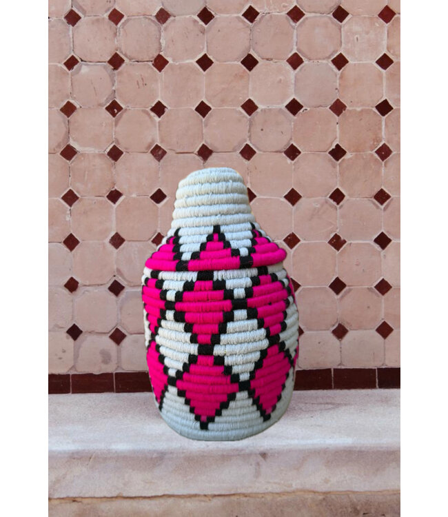 De manden zijn volledig met de hand gemaakt in het noorden van Marokko. De manden krijgen hun eigen patroon en kleur welke handmatig met wol op de mand wordt geweven. Van elke mand is er slechts één stuk verkrijgbaar en is daardoor uniek in zijn soort!