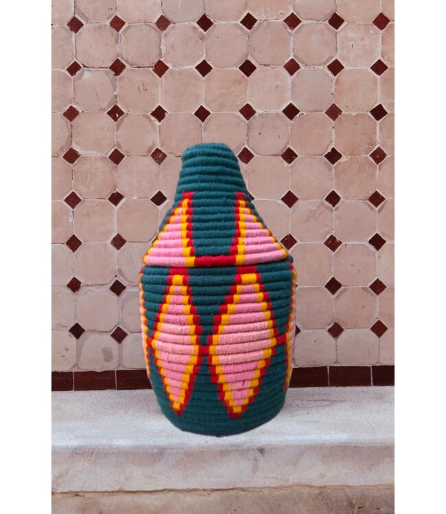 De manden zijn volledig met de hand gemaakt in het noorden van Marokko. De manden krijgen hun eigen patroon en kleur welke handmatig met wol op de mand wordt geweven. Van elke mand is er slechts één stuk verkrijgbaar en is daardoor uniek in zijn soort!