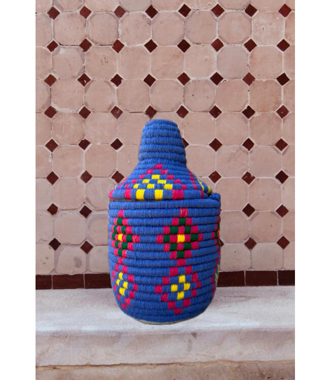 De manden zijn volledig met de hand gemaakt in het noorden van Marokko. De manden krijgen hun eigen patroon en kleur welke handmatig met wol op de mand wordt geweven. Van elke mand is er slechts één stuk verkrijgbaar en is daardoor uniek in zijn soort!