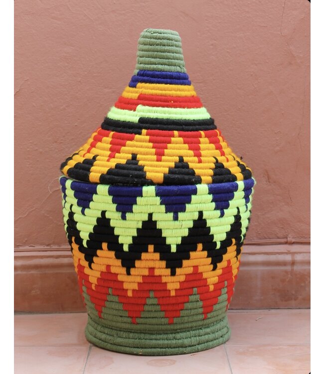 De manden zijn volledig met de hand gemaakt in het noorden van Marokko. De manden krijgen hun eigen patroon en kleur welke handmatig met wol op de mand wordt geweven. Van elke mand is er slechts één stuk verkrijgbaar en is daardoor uniek in zijn soort!