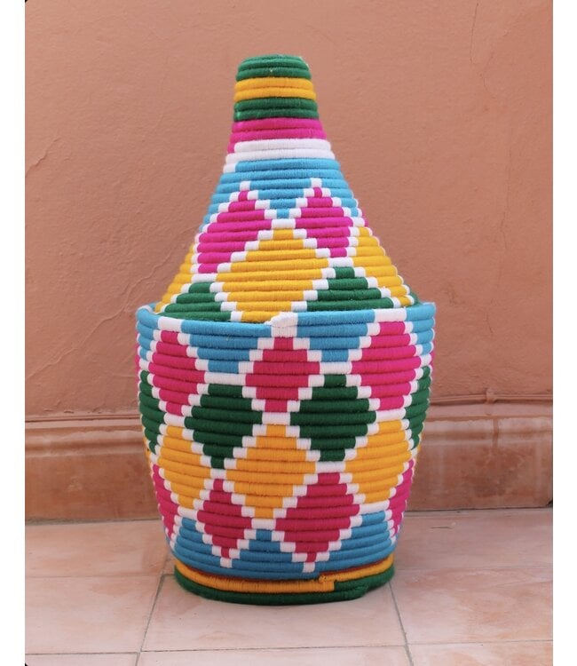 De manden zijn volledig met de hand gemaakt in het noorden van Marokko. De manden krijgen hun eigen patroon en kleur welke handmatig met wol op de mand wordt geweven. Van elke mand is er slechts één stuk verkrijgbaar en is daardoor uniek in zijn soort!