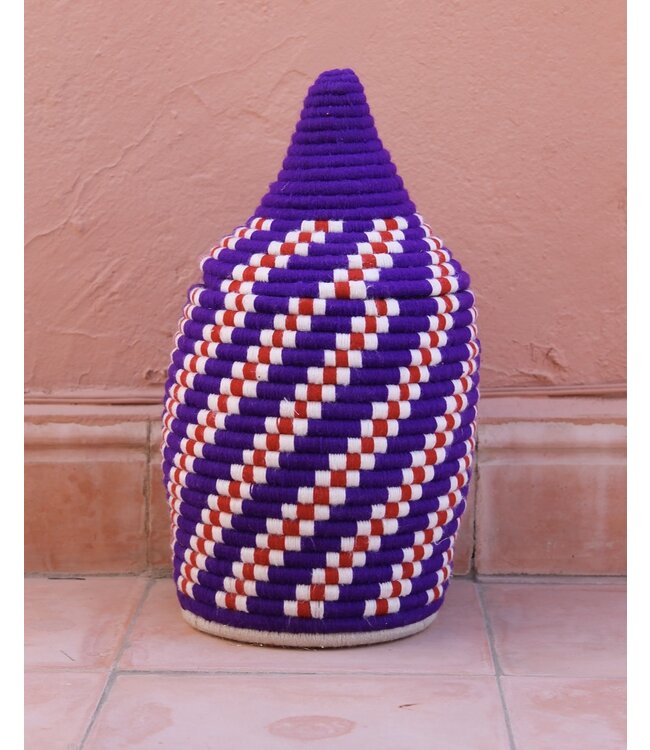 De manden zijn volledig met de hand gemaakt in het noorden van Marokko. De manden krijgen hun eigen patroon en kleur welke handmatig met wol op de mand wordt geweven. Van elke mand is er slechts één stuk verkrijgbaar en is daardoor uniek in zijn soort!