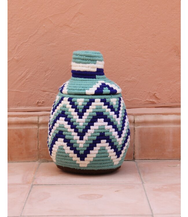 De manden zijn volledig met de hand gemaakt in het noorden van Marokko. De manden krijgen hun eigen patroon en kleur welke handmatig met wol op de mand wordt geweven. Van elke mand is er slechts één stuk verkrijgbaar en is daardoor uniek in zijn soort!