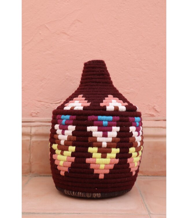 De manden zijn volledig met de hand gemaakt in het noorden van Marokko. De manden krijgen hun eigen patroon en kleur welke handmatig met wol op de mand wordt geweven. Van elke mand is er slechts één stuk verkrijgbaar en is daardoor uniek in zijn soort!