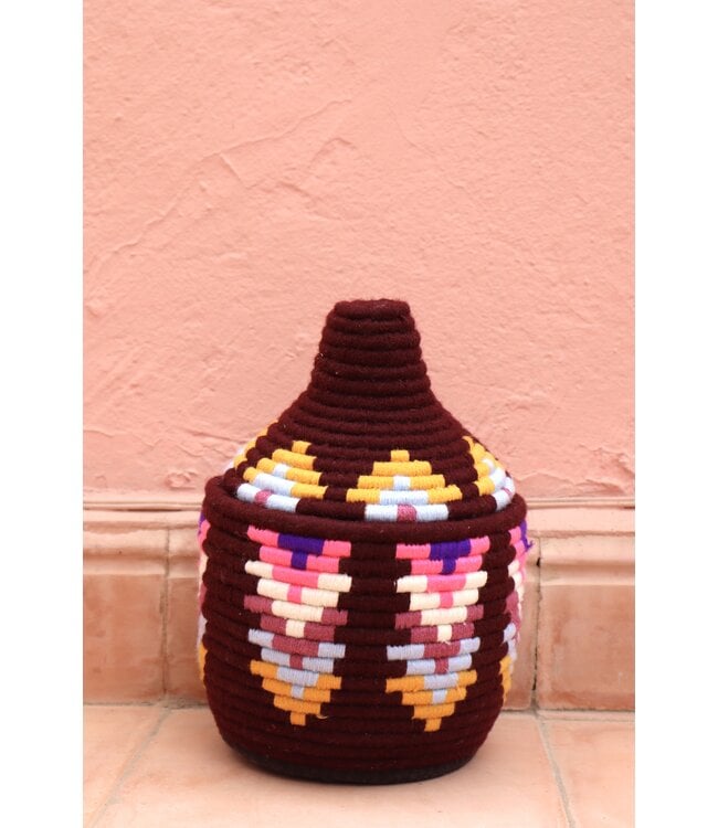 De manden zijn volledig met de hand gemaakt in het noorden van Marokko. De manden krijgen hun eigen patroon en kleur welke handmatig met wol op de mand wordt geweven. Van elke mand is er slechts één stuk verkrijgbaar en is daardoor uniek in zijn soort!
