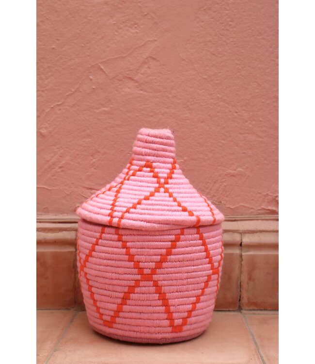 De manden zijn volledig met de hand gemaakt in het noorden van Marokko. De manden krijgen hun eigen patroon en kleur welke handmatig met wol op de mand wordt geweven. Van elke mand is er slechts één stuk verkrijgbaar en is daardoor uniek in zijn soort!