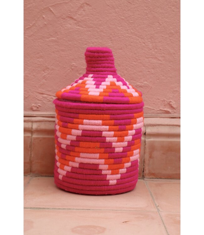 De manden zijn volledig met de hand gemaakt in het noorden van Marokko. De manden krijgen hun eigen patroon en kleur welke handmatig met wol op de mand wordt geweven. Van elke mand is er slechts één stuk verkrijgbaar en is daardoor uniek in zijn soort!