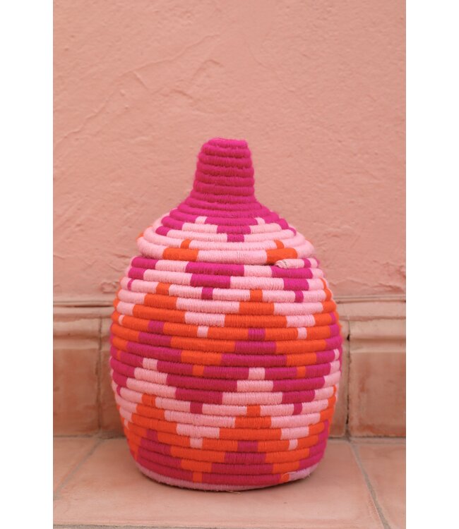 De manden zijn volledig met de hand gemaakt in het noorden van Marokko. De manden krijgen hun eigen patroon en kleur welke handmatig met wol op de mand wordt geweven. Van elke mand is er slechts één stuk verkrijgbaar en is daardoor uniek in zijn soort!