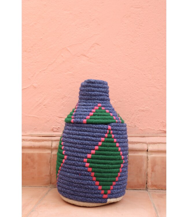 De manden zijn volledig met de hand gemaakt in het noorden van Marokko. De manden krijgen hun eigen patroon en kleur welke handmatig met wol op de mand wordt geweven. Van elke mand is er slechts één stuk verkrijgbaar en is daardoor uniek in zijn soort!