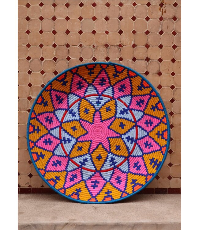 De wollen schalen zijn met de hand vervaardigd in het noorden van Marokko. Elke schaal krijgt een eigen patroon en kleur welke met wol op de schaal wordt geweven. Een eyecather voor aan de muur of gebruik ze bijvoorbeeld als fruit- of broodschaal. Van elke schaal is er slechts één stuk verkrijgbaar en is daardoor uniek in zijn soort!