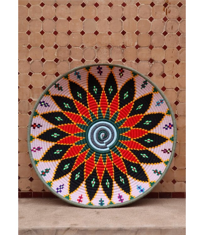 De wollen schalen zijn met de hand vervaardigd in het noorden van Marokko. Elke schaal krijgt een eigen patroon en kleur welke met wol op de schaal wordt geweven. Een eyecather voor aan de muur of gebruik ze bijvoorbeeld als fruit- of broodschaal. Van elke schaal is er slechts één stuk verkrijgbaar en is daardoor uniek in zijn soort!
