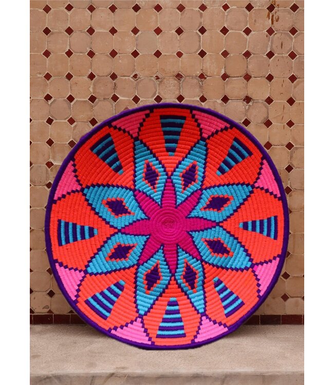 De wollen schalen zijn met de hand vervaardigd in het noorden van Marokko. Elke schaal krijgt een eigen patroon en kleur welke met wol op de schaal wordt geweven. Een eyecather voor aan de muur of gebruik ze bijvoorbeeld als fruit- of broodschaal. Van elke schaal is er slechts één stuk verkrijgbaar en is daardoor uniek in zijn soort!